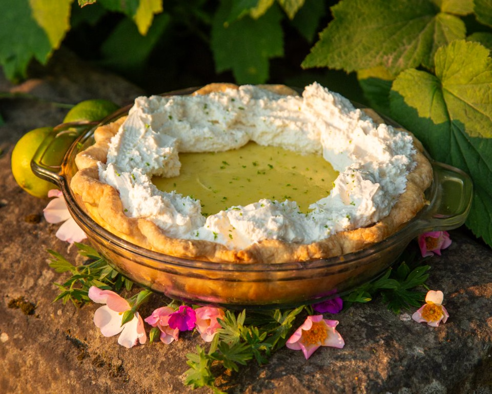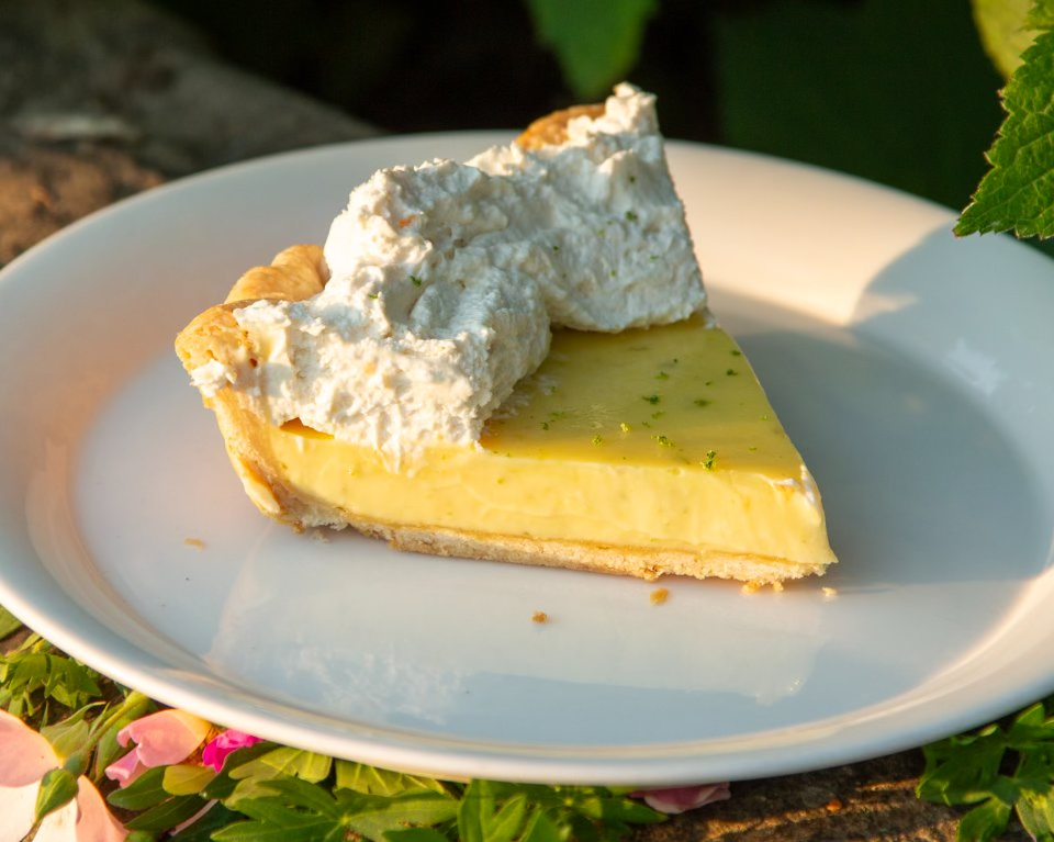 Key Lime custard made with coconut cream, in an all butter crust topped with our homemade vanilla whipped cream and toasted coconut flakes.